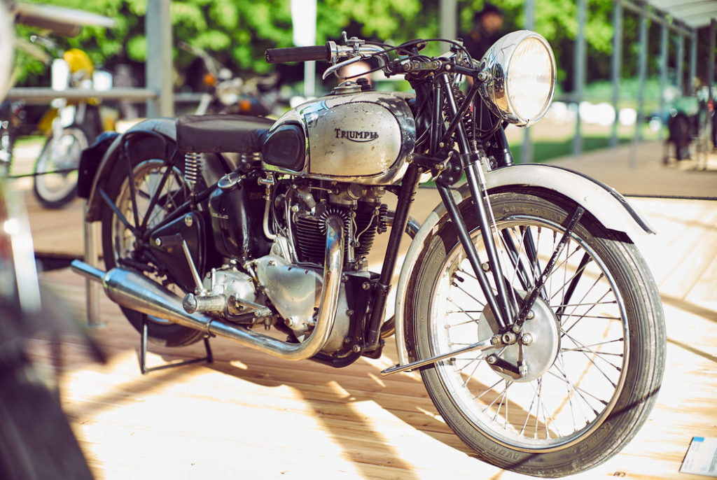 Speed Twin 5T z roku 1938. Tento raný model má válec připevněný ke klikové skříni pouze 6ti šrouby (později 8). Toto upevnění se brzy ukázalo jako nespolehlivé – bloky válců měly tendenci se zdvíhat při setrvalém vysokém plynu. Dva další šrouby byly přidány v roce 1939. Amarantově červená barva laku Triumphu (ve skutečnosti tmavě hnědočervená) dodávala Speed Twinu punc energie a vášně.