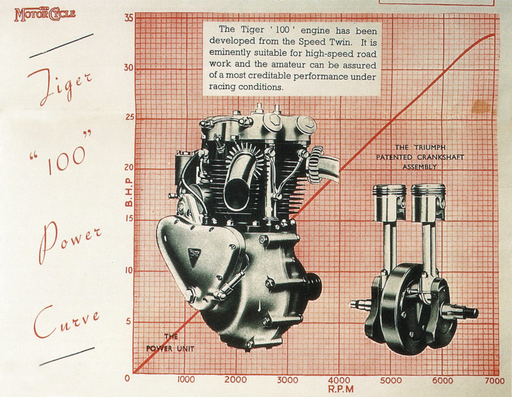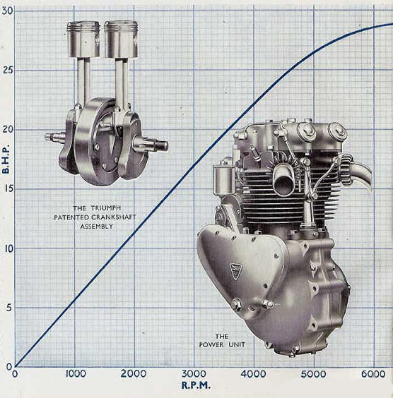 Křivka ukazuje průběh výkonu motoru v závislosti na otáčkách. Speed twin se pyšnil 28,5 koňskými silami při 6000 otáčkách za minutu. Kresba z roku 1946.