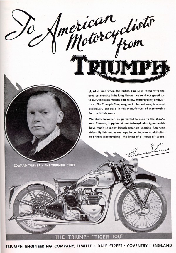 Doma v Anglii však Turner neusínal na vavřínech Speed Twinu. Ještě před uvedením této motorky plánoval další. Byl jím Tiger 100 – „nadupaná, sportovní verze Speed Twinu“. T100 byl uveden v roce 1939. Mohl se chlubit vyšším kompresním poměrem (7,75:1), kovanými písty, leštěnými přívodními kanály a mírně větším (1,0-palcovým) karburátorem. Speciální výfukové tlumiče měly odnímatelné uzávěry – stačilo pár minut se šroubovákem v ruce a měli jste otevřené roury na závody! To vše dohromady dávalo o 5 koňských sil navíc než Speed Twin a umožňovalo Tigeru dosahovat poctivé nejvyšší rychlosti 100 mil za hodinu. Barvu zdědil po svých předchůdcích řady Tiger, avšak blatníky byly vždy stříbrné s černým pruhem a modrými linkami.