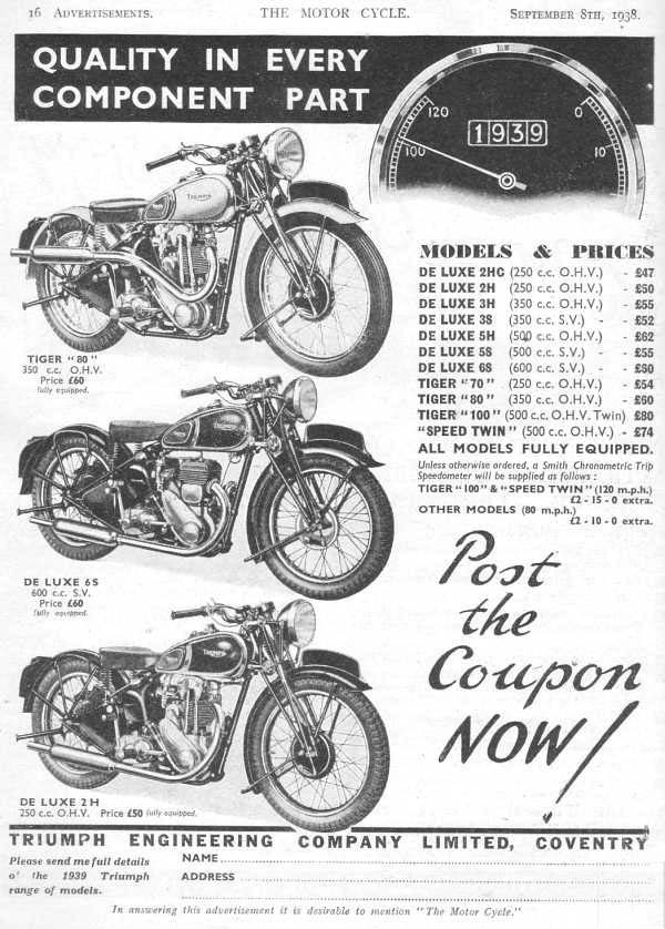 Když začala Druhá světová válka, Triumphu se dařilo. Společnost držela rychlostní rekordy na okruhu Brooklands pro 350 cc, 500 cc a 750 cc. Začali vyvíjet zcela nový vertikální dvouválec 350 cc, naplánovaný na rok 1940 ve standardním (3T) a sportovním (Tiger 85) provedení. Projekt byl však kvůli válce zrušen.
